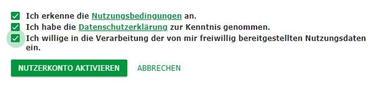 Nach dem Klick auf ANMELDEN folgt die Aufforderung, den Nutzungsbedingungen und der Datenschutzerklärung unten auf der Seite zuzustimmen, bevor man das NUTZERKONTO AKTIVIEREN kann: