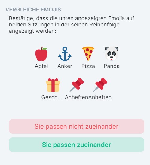 Du kannst die Sitzung auch durch den Abgleich mit Emojis verifizieren. Wenn du dich für die Emojis entscheidest, erscheint auf beiden Geräten eine bestimmte Auswahl an Bildern, z.B.: