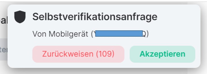 Öffne den Messenger auf einem bereits sicher angemeldeten Gerät. Es erscheint ebenfalls eine Aufforderung zur VERIFIZIERUNG. Klicke sie an und bestätige die Freischaltung für das „neue“ Gerät/die „neue“ Anwendung.