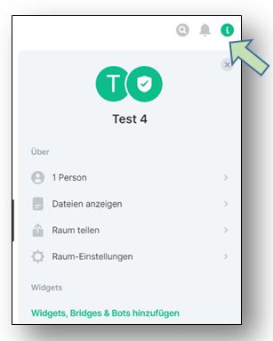 Über die 3 Punkte neben dem Raum auf der rechten Seite des Bildschirms (bei der App durch langes Gedrückt-Halten) erscheinen die gleichen Auswahlmöglichkeiten wie beim privaten Chat, also z.B. Einstellungen, Priorisierung oder Raum verlassen. Zusätzlich kann ein Direkt-Link zu dem Raum abgerufen werden.