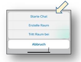 Auf der App klickst du auf den grünen Kreis mit dem Plus am unteren rechten Rand. Wähle „Starte Chat“, dann folgt ebenfalls die Aufforderung, den Namen einzugeben. Bestätige den Beginn deines Chats abschließend über „Starte“.